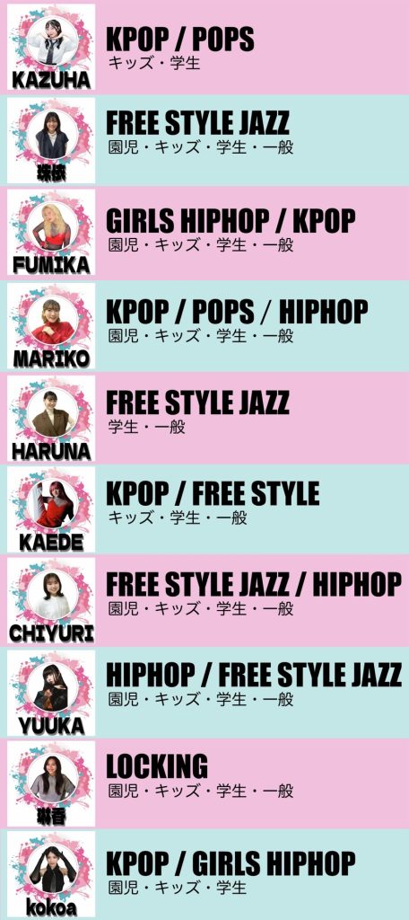 ユウカ先生、マリコ先生、ココア先生、カズハ先生、フミカ先生、カエデ先生、ミイ先生、ハルナ先生、ミィ先生、チユリ先生 可愛く、かっこいい振り付けです⭐️